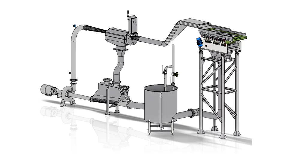水刀切割线由输料泵、输料管道及刀头组成,可将物料切割成条状、片状、楔形或其他可能的形状,具有切割速度快、物料损耗低、刀头全自动切换、操作简便、组线灵活,根据选配的不同,每小时产能可达 3 到 15 吨。